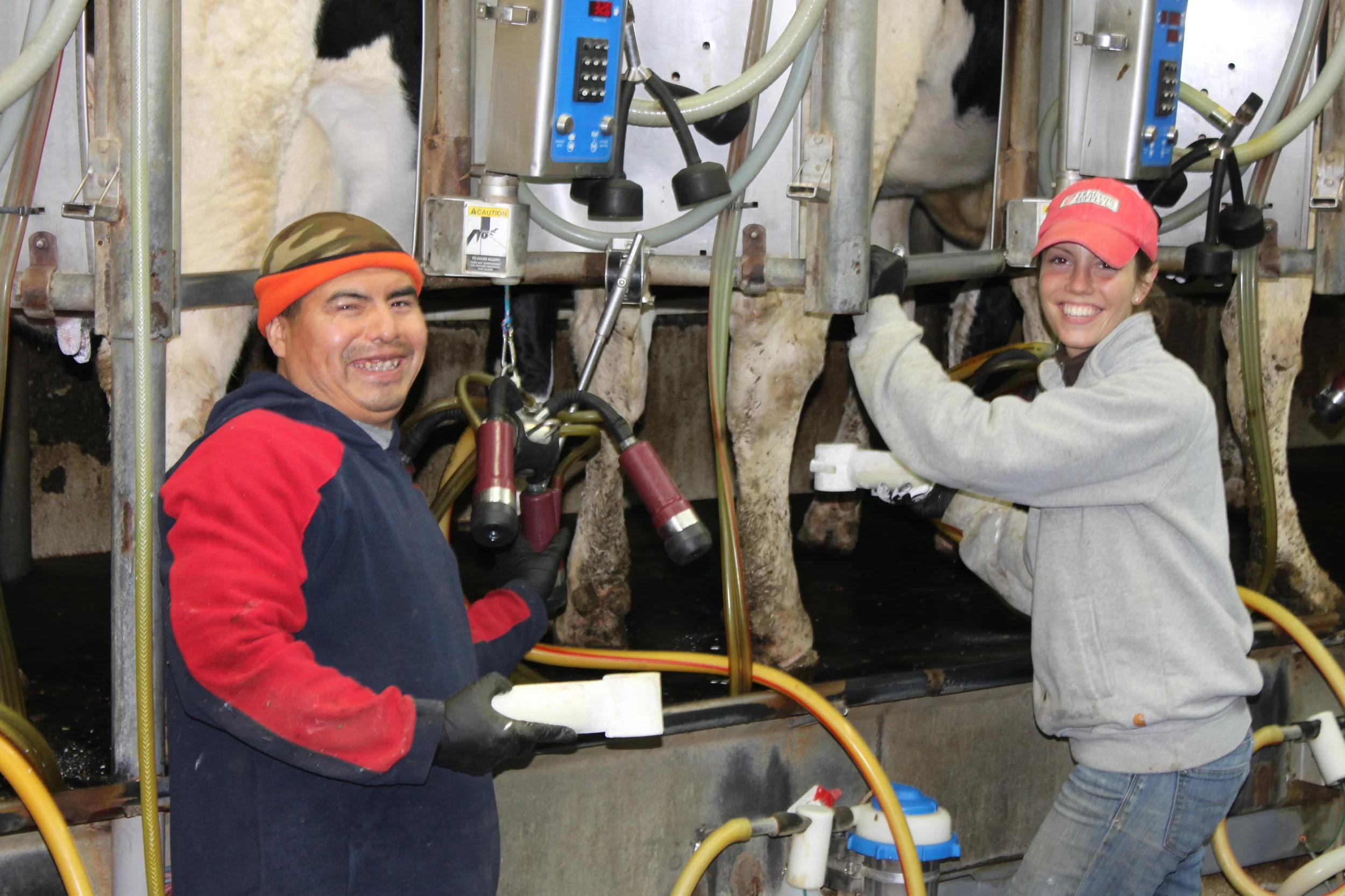 Nemo and Paige in the milking parlor. Our cows are milked twice a day.